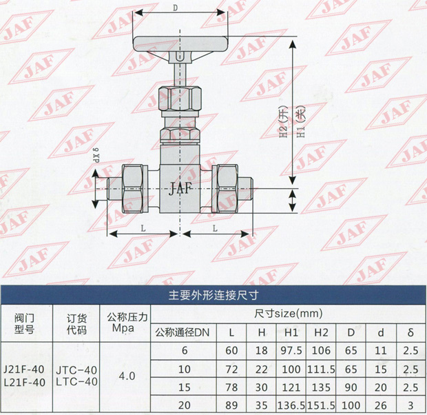 適用范圍 適用于公稱壓力為PN4.0MPa,公稱通徑為DN6、DN10、DN15和DN20,進出口螺紋連接閥體材料為鋼質(zhì)的直通截止閥和節(jié)流閥?! ¢y門屬性 公稱壓力為PN4.0MPa,試驗壓力為PN6.0MPa,適用溫度為-50°C-+200°C適用介質(zhì)為氨、氟等?! 表示截止閥 L表示節(jié)流閥 T表示結(jié)構(gòu)形式為直通式 G表示管接頭連接 40代表公稱壓力為4.0MPa,40后不標注代表代表閥體材質(zhì)為鍛鋼。